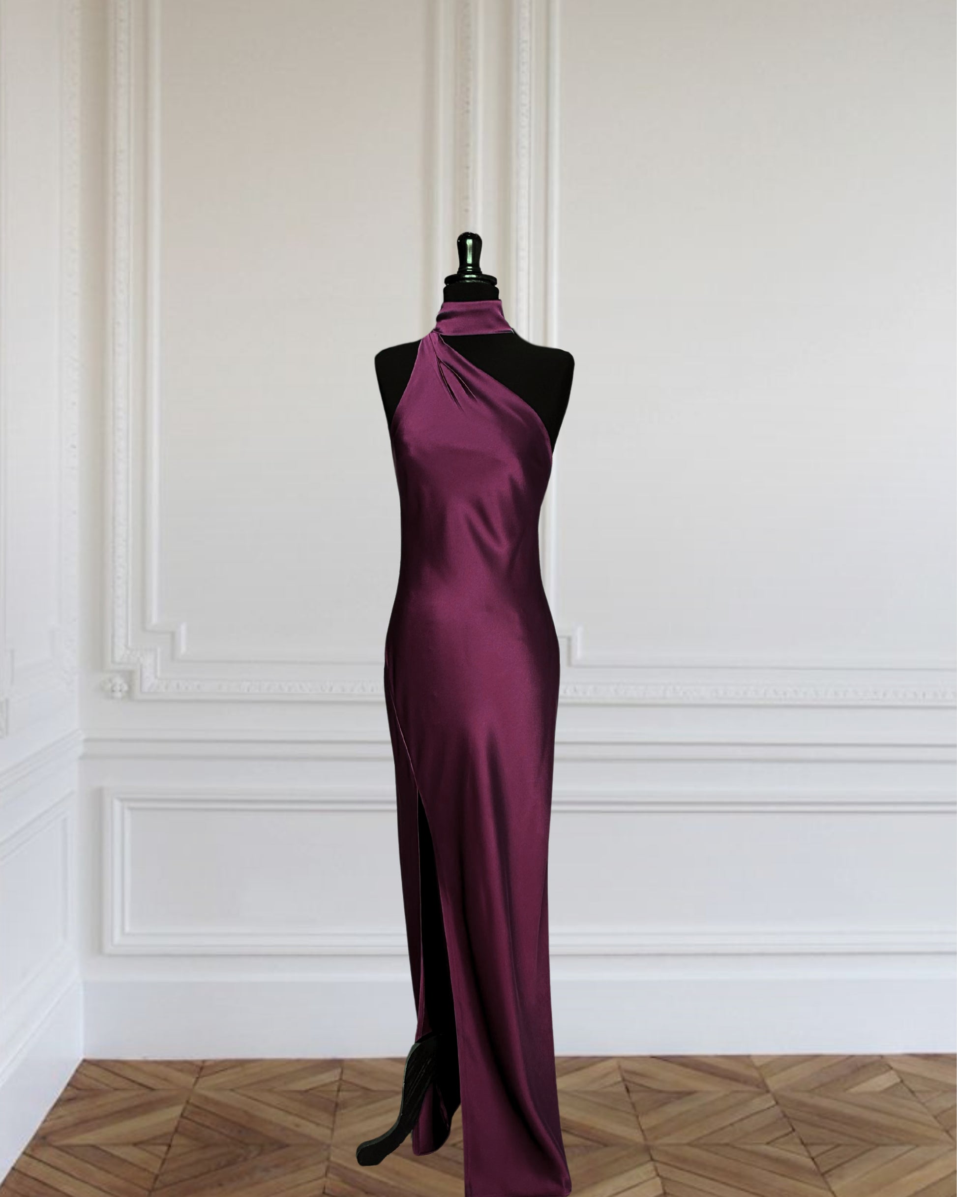Pieza de alta costura con diseño asimétrico que combina textiles nobles como piel de seda, satén y piel de ángel en una construcción refinada. Confeccionado artesanalmente en Chile, este vestido destaca por su corte innovador y la calidad superior de sus materiales, ofreciendo elegancia sofisticada para ocasiones especiales.